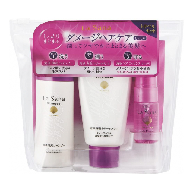 ラサーナ海藻海泥シャンプー・ラサーナ海藻海泥トリートメント・ラサーナ海藻ヘアエッセンスの5日間使用のトラベルセット。