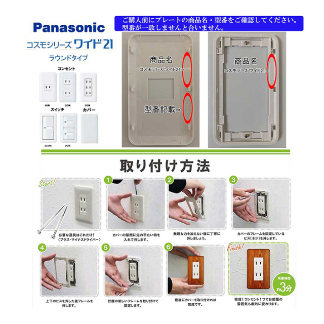 ※コンセントカバーは、パナソニック 【コスモシリーズワイド21】タイプです。ご購入の前に交換予定のカバーを一度外し、裏面のメーカー名・型番のご確認をお願いします。