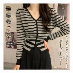 2025新作 レディース ボーダー柄 ニットトップス Vネック ストライプ柄 長袖 細見え 韓国風