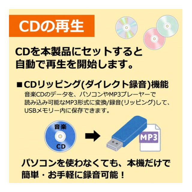 ●CDリッピング(ダイレクト録音)機能も付いており、音楽CDのデータをMP3形式に変換してUSBメモリーに保存が可能。