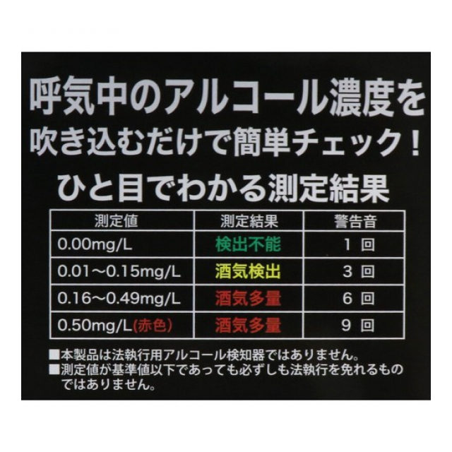 | センサー種類:半導体式ガスセンサー メモリー機能:測定結果99件記録 センサー寿命:1500回又は2年のどちらか早い方 使用電池:リチウムイオン蓄電池DC3.7V 300mA 充電池(1度の充電で約300回使用可能) 充電時間:約2時間 入力電圧:DC5V1A 使用可能ストローサイズ:6? 保証期間:1年 セット内容:本体・マウスピース×4・USBケーブル 測定範囲:0.00?0.50mg/L(単位mg/L:呼気中アルコール濃度) |