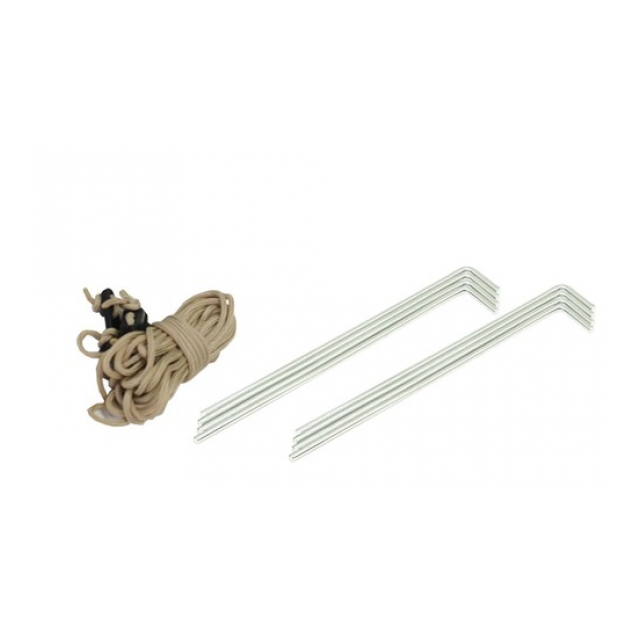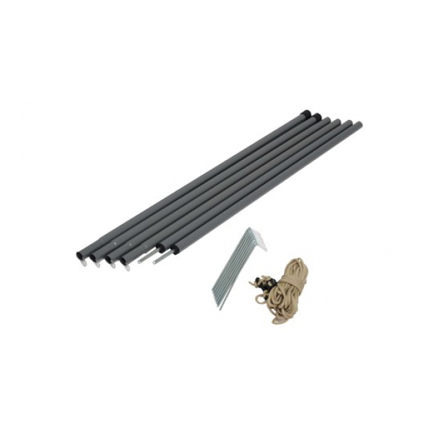 ポリエステル(UPF 50+)ポリプロピレン・金属 ■重 量:約1.3kg(収納時)約1.4kg(箱込) ■付属品: 組立式ポール1.8m×2セット 1.8mロープ×4本、2.8mロープ×4本 ペグ×8本、収納袋×1個 |