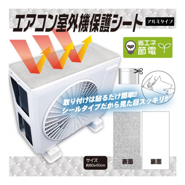| アルミ膜、ポリエチレン、?離紙 【注意事項】 ●本製品を本来の用途以外に使用しない。 ●室外機の吸気部、排気部を塞ぐような取付はしないでください。 ●室外機の形状などによっては貼り付けられない場合があります。 ●室外機の汚れを取り除いてから、張り付けてください。 ●尖った物で突いたり、強い衝撃などで破損することがあります。 ●火気のそがには置かないでください。 ●材質の特性上経年劣化いたします。劣化により破損した場合は新しいものに取り換えていただくことをお勧めします。 ●汚れた場合は、水又は中性洗剤を含ませた布で拭きとってください。 ●シンナー、ペンジン、アルコールなどの有機溶剤や化学洗剤での清掃は行わないでください。 ●廃棄する場合は、各自治体の処分方法に従って処理してください。 |