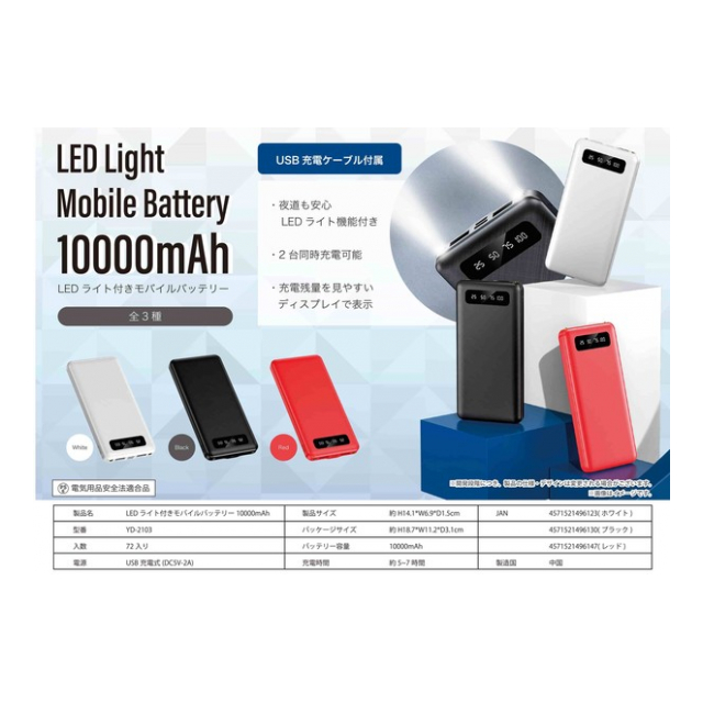【予約】LEDライト付きモバイルバッテリー 10000mAh YD-2103