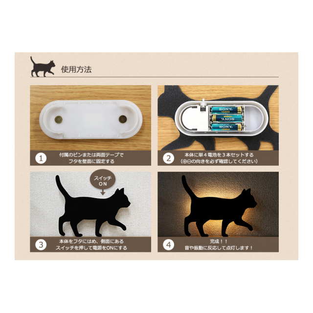 ・使用方法:壁面取付(ピンまたは両面テープ)