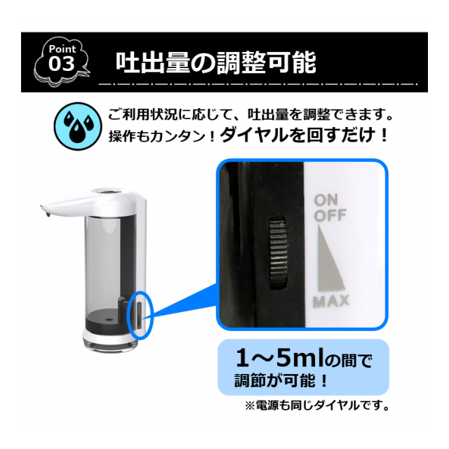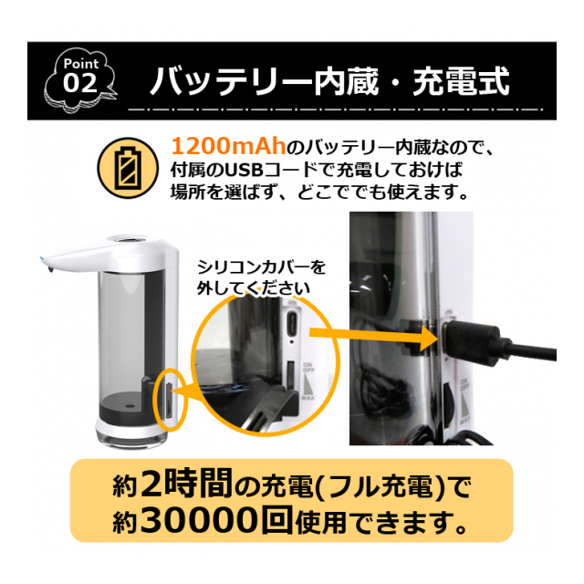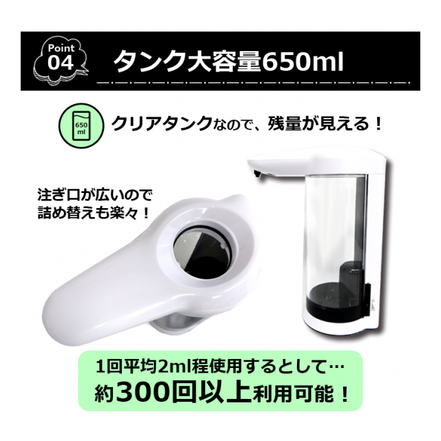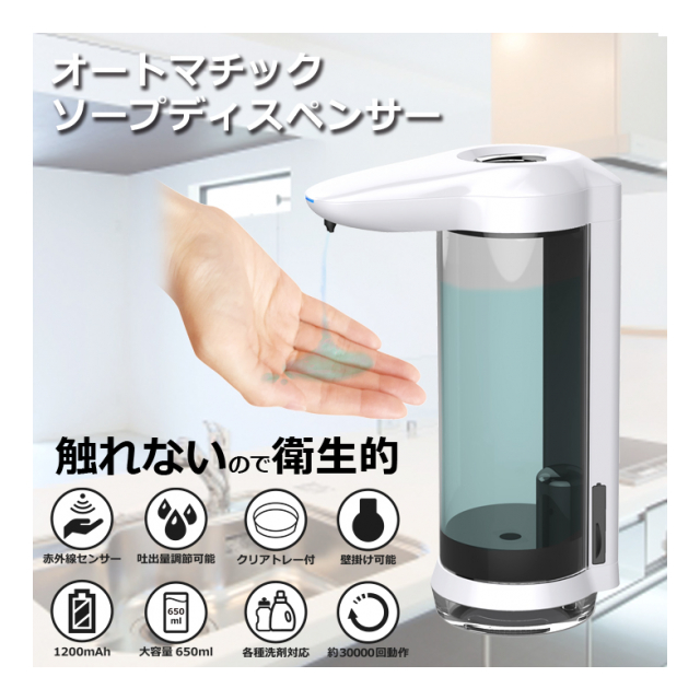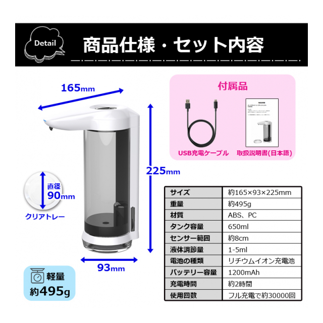 | 素材:ABS/PC センサー範囲:約10cm 液体調節量:1~5ml 電源:リチウムイオン充電池 バッテリー容量:1,200mAh 充電時間:約2時間 使用回数:フル充電で約30,000回 |