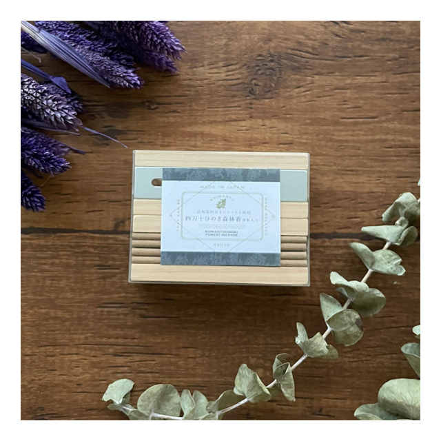 ひのきの香りは、深いリラックス状態の脳波であるアルファー派を誘発し、交感神経の高ぶりをおさえ、呼吸を正常に整える作用があります。ひのきの葉や端材から抽出した成分で作られた、ひのきの香りのお香です。線香8本、ひのきで作られた香立て付き。四万十の森林香りをお楽しみください。日々頑張るご自分へのご褒美に、大切なあの人へのやさしいギフトにいかがでしょうか。