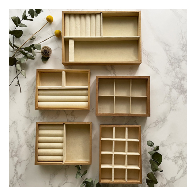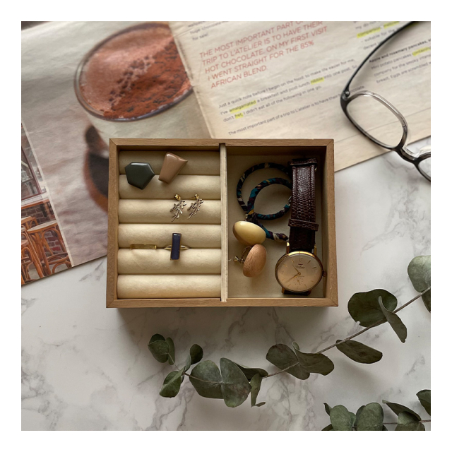 アクセサリーや腕時計を飾ることができる、大きめの仕切りが1つ付いた木製収納BOX。
