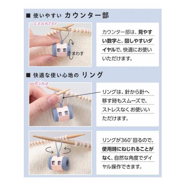 輪針、棒針両方に使える、目数と段数を記録できるリング式のカウンター。