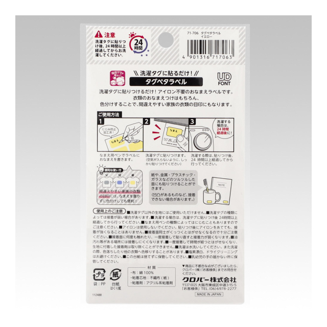 | ◆洗濯タグに貼り付け後、24時間以上経過してからお洗濯してください。◆ ※おなまえ用の油性ペンをお使いください。 ※ペンの種類によっては、書いた文字がにじんだり、薄くなったりする場合があります。 ※洗濯タグ以外の生地にはご使用いただけません。 ※洗濯タグの素材によっては剥がれやすい場合があります。 ※乾燥機をご使用の際、状況によっては剥がれやすい場合があります。 ※塩素漂白はお避けください。 ※ドライクリーニングはお避けください。 ※乳幼児の手の届かない所に保管してください。 |