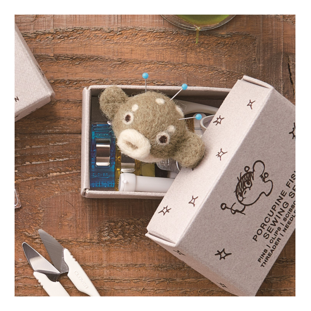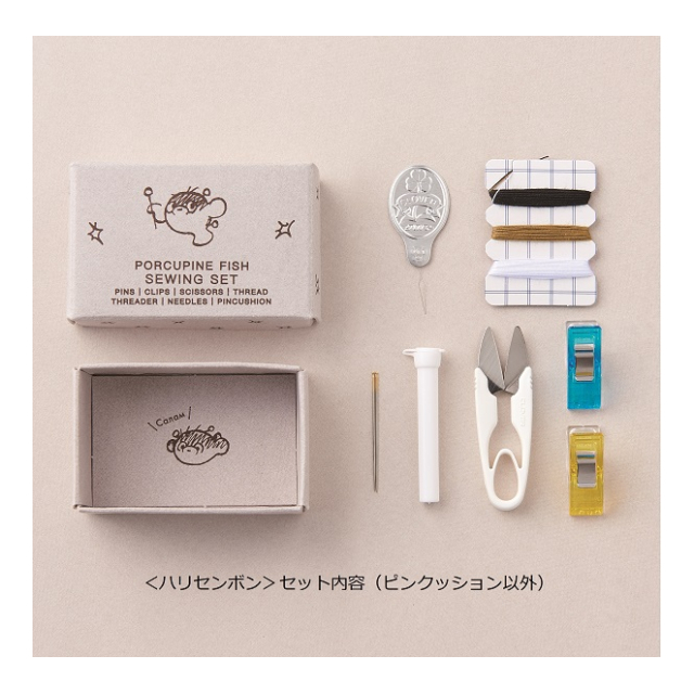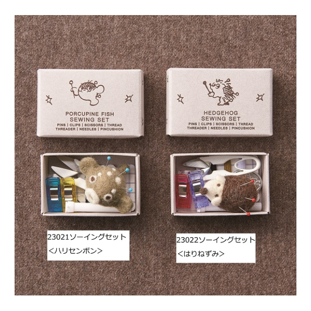| <パッケージサイズ>100×160×28mm <本体サイズ> ミニピンクッション(ハリセンボン)のサイズ:約4.5X2.5cm ミニピンクッション(はりねずみ)のサイズ:約4X2.5cm 収納箱(共通):約4.6X7X2.7cm <セット内容> ピンクッション:1個、糸切はさみ:1丁、縫い針(ケース入り):2本、仮止めクリップ:2個、待針(ピンクッションに刺されています)3本、縫い糸:3色(黒・ベージュ・白)、スレダー:1枚、収納箱:1個 <生産地> 日本(ピンクッション:キルギス、スレダー:タイ) |