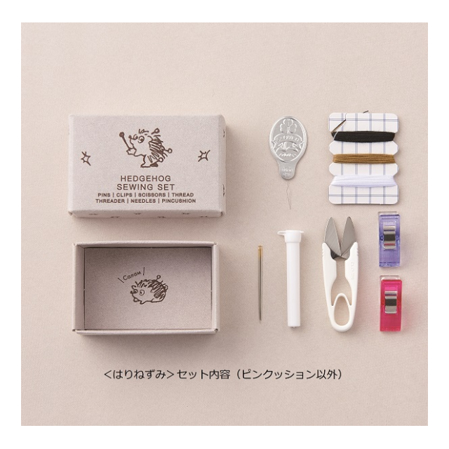 | ミニピンクッション:ウール100%、糸切はさみ:(刃部)ステンレス鋼(柄部)ABS樹脂、縫い針:鋼(ニッケルメッキ・金メッキ)、針ケース:ポリプロピレン、仮止めクリップ:ポリカーボネート・ステンレス鋼、待針:鋼(ニッケルメッキ)/頭部:ガラス、縫い糸:ポリエステル100%、スレダー:(本体)アルミニウム(線材)ステンレス鋼、収納箱:紙 |