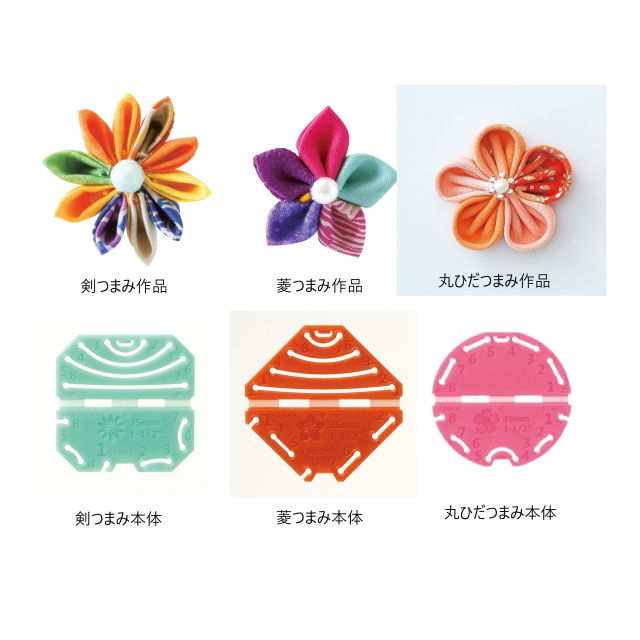 | <セット内容>つまみ細工プレートSSサイズ 剣つまみ/菱つまみ/丸ひだつまみ 各1個入り <パッケージサイズ>130X280mm <作品できあがりサイズ>(直径)約3.5cm |