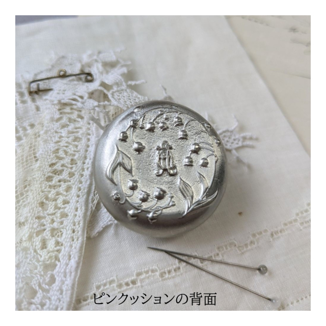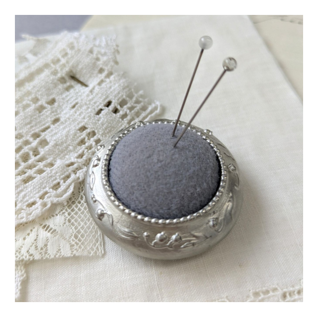 錫でできたアンティーク風のピンクッション。平らな形で、安定感があります。