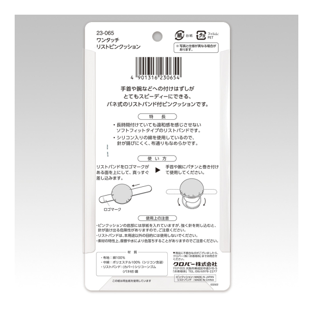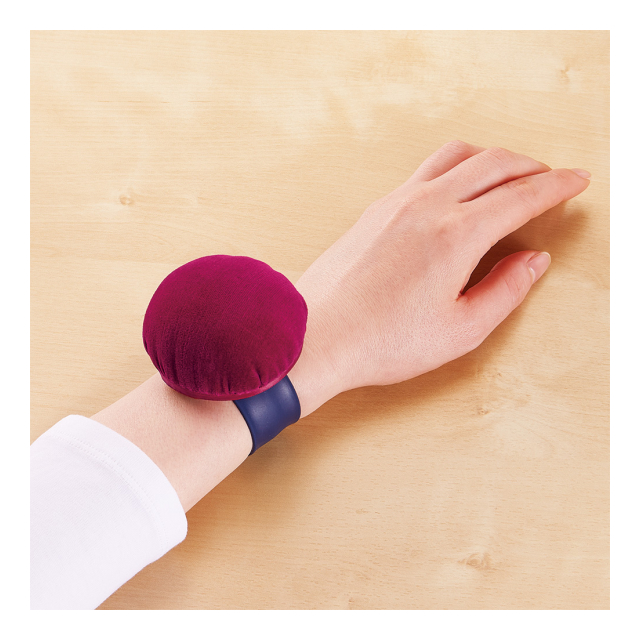 | <ピンクッション>布地:綿100%、中わた:ポリエステル100%(シリコン含浸) <リストバンド>カバー:シリコーンゴム、バネ材:鋼 |
