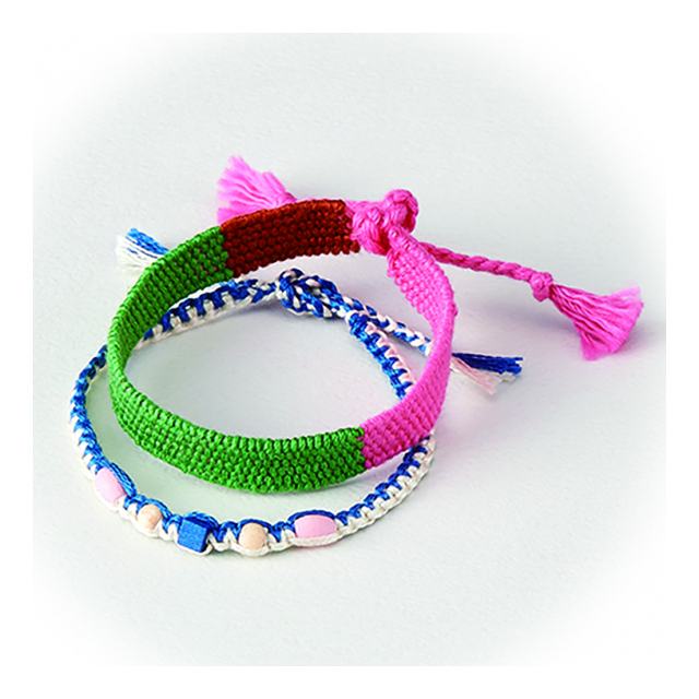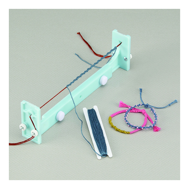 本体に張ったたて糸に、別糸で結んだり織ったりしてブレスレットが作れます。