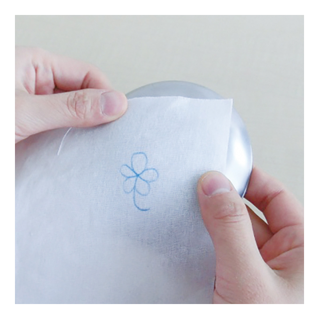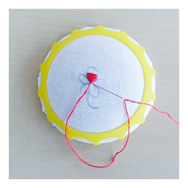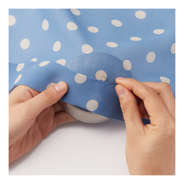 ドーム型の道具を布の下にあてがい、付属のゴムかクリップで留めて、刺しゅうやかがり縫いができます。