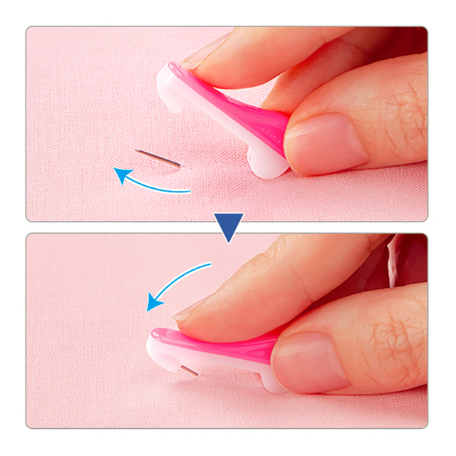 2.押すだけで 針を開閉!/針を指で押し上げる必要がないので、指を痛めません。ミシンがけの時も、片手で外すことができます。