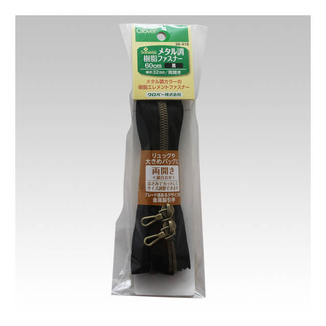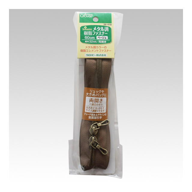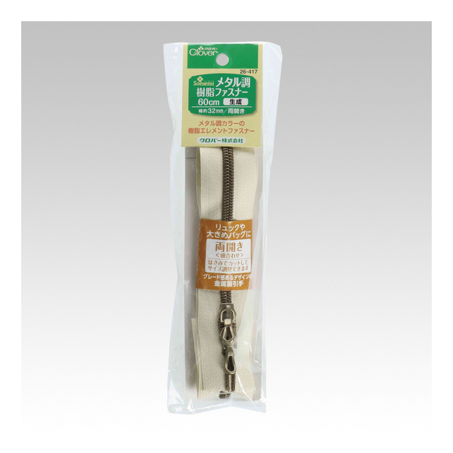 《クロバー》 メタル調樹脂ファスナー 60cm 両開き(頭合わせ)生成・ベージュ・黒 【日本製】