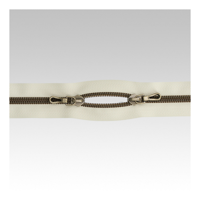 メタル調カラーの樹脂エレメントファスナー。 はさみでカットして長さの調整ができるソフトな樹脂製コイルエレメントの両開き頭合わせファスナーです。 エレメントのカラーはアンティークなメタリック調です。 アンティークゴールドの金属製引手付き。ノンロックスライダーファスナーなので、バッグやリュックなどにおすすめです。