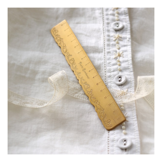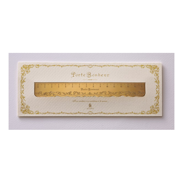 この定規は真鍮に繊細なすずらん模様を施し、日本古来より伝わる「煮色」という伝統工芸の技法を用いてアンティーク風な風合いに仕上げました。