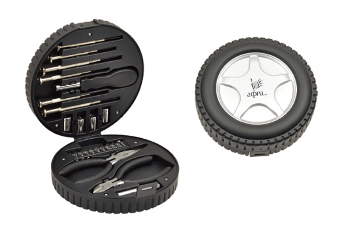 タイヤ型の工具セットです.この商品はホイールセンターへのロゴプリントのみとなります.