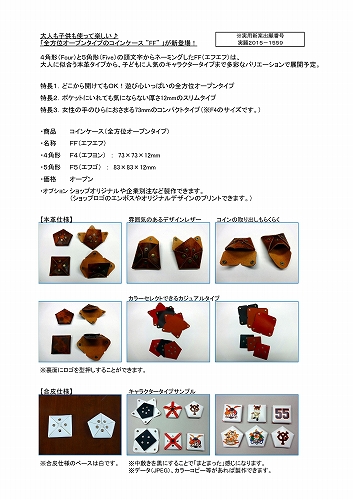 4角形(Four)と5角形(Five)の頭文字からネーミングしたFF(エフエフ)コインケースは、全方位オープンタイプの遊び心いっぱいのコインケースです。※実用新案出願中商品