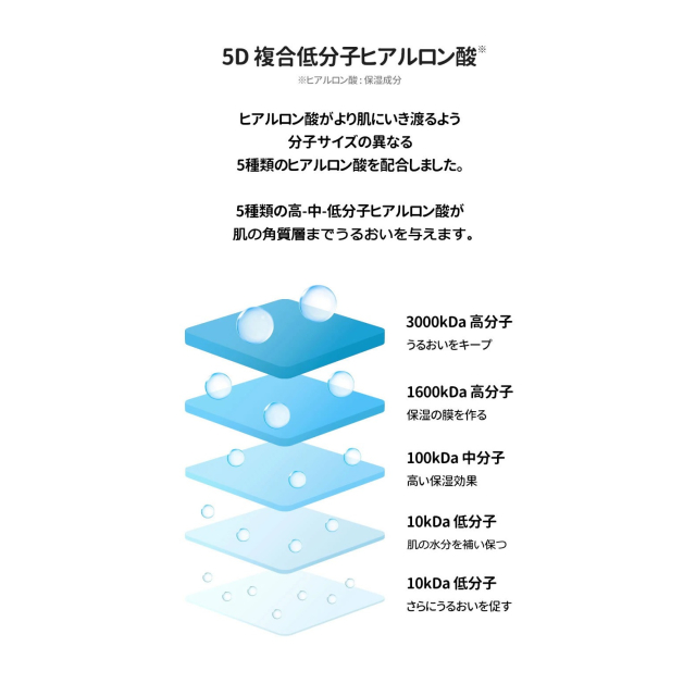 5Dー複合ヒアルロン酸はお肌へ吸収されやすくしっとりしながらもサラサラした仕上りが特徴です。