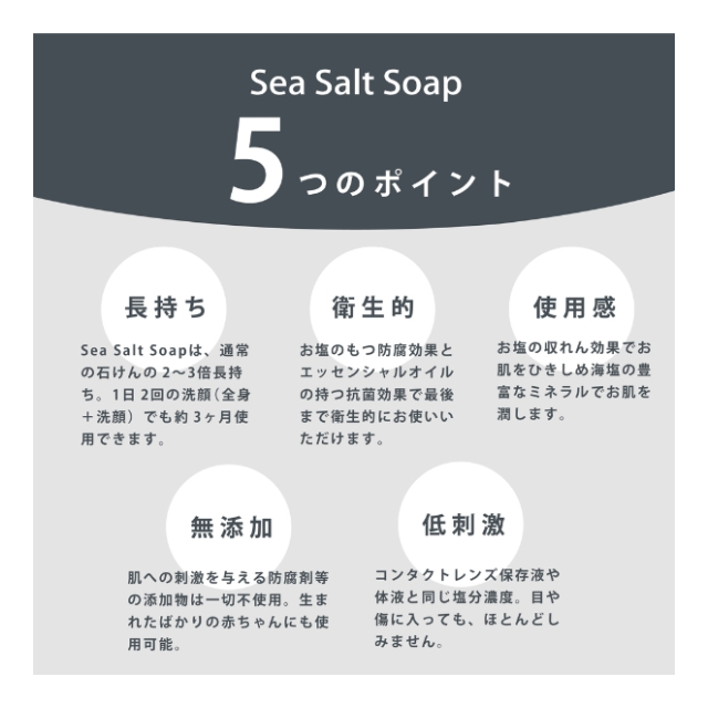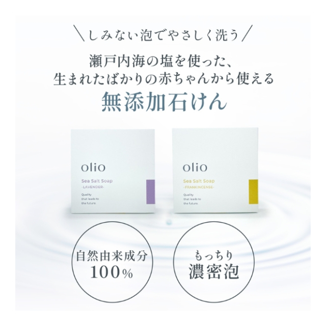 植物性の石けん素地と瀬戸内海の海水からとれた塩でできた無添加石けん。
