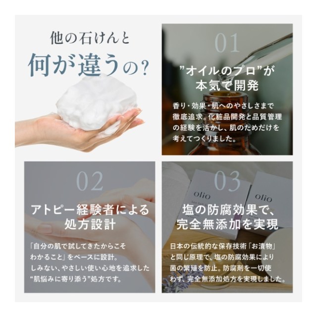 高密度の塩石けんは、もっちりとした泡が特徴的。
