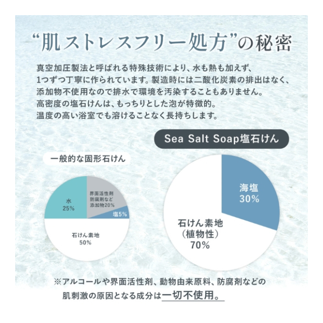 植物性の石けん素地と瀬戸内海の海水からとれた塩でできた無添加石けん。