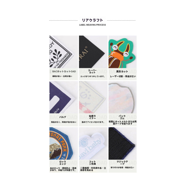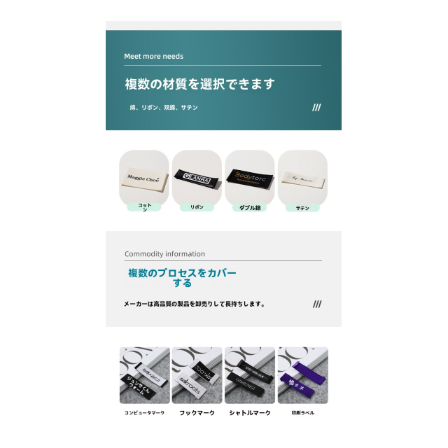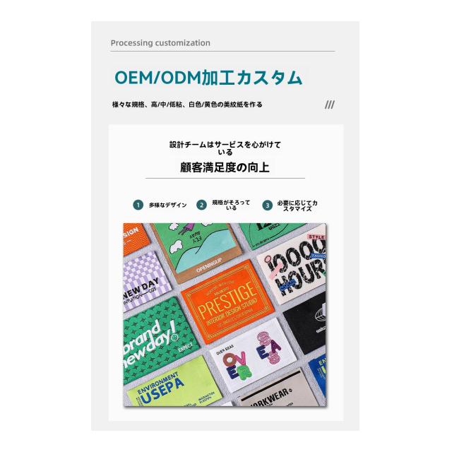 ニッチなデザイナーブランドであれ、ユニークでワンオブアカインドなスタイルを追求するものであっても、大規模な衣料品企業であれ、統一された規格のブランド識別を必要とするものであっても、当社はすべてカスタマイズ対応いたします。ラベルの形やサイズの大きさから、テキストのレイアウトや図案のデザインまで、あなたのクリエイティブなアイデアに完全に合わせます。当社には専門のデザインチームがあり、あなたにクリエイティブなアドバイスとデザイン案を提供し、すべての洗濯表示ラベルと刺繍ラベルが衣類の見せ場になるようにします。当社のカスタマイズされた洗濯表示ラベルと刺繍衣類ラベルを選ぶことで、あなたの衣類に専属のアイデンティティを作り出し、市場で際立って目立ち、ブランドイメージを向上させる新たな旅をスタートさせましょう。