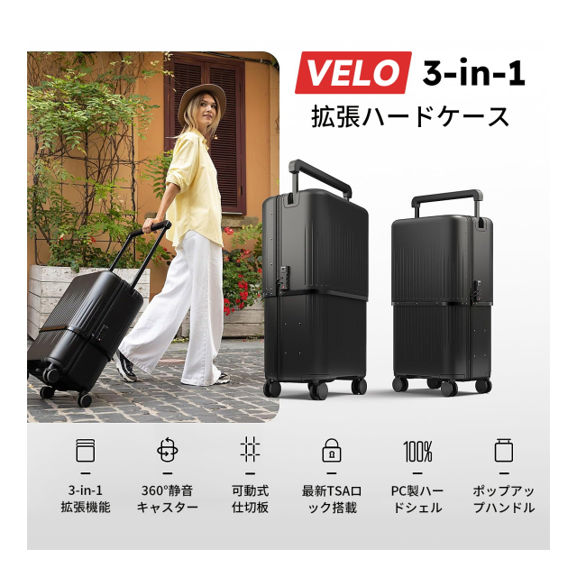 【Makuakeで「スーツケース」NO.1】 VELO 3サイズに変身できる拡張式ハードスーツケース