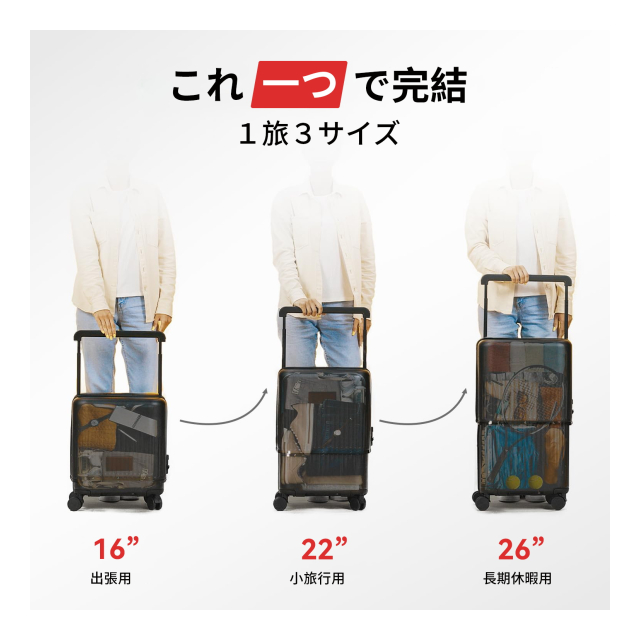 【3サイズ自由自在】旅行の悩みを解決する革新的キャリーケース ボタンひとつで瞬時にサイズ変形!機内持ち込み対応の16インチ(約40cm)から、帰国時には26インチ(約66cm)へ拡張可能。JAL・ANAなど主要国際線のキャビンサイズに完全対応しており、お土産をたっぷり詰め込んでも追加料金の心配は不要です。新幹線の網棚にもすっきり収まる薄型設計で、日本国内の移動にも最適な“魔法のスーツケース”です。