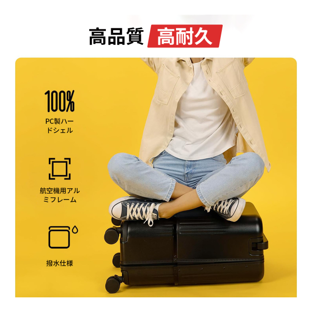 【高品質ボディ&安心のファスナー】 軽量かつ弾力性に優れたABS樹脂と、耐衝撃性・断熱性に優れたPC(ポリカーボネート)樹脂を融合させた高耐久のハードボディを採用。日常使いにも、長期旅行にも安心してお使いいただけます。メインファスナーには、日本が世界に誇るファスナーを使用し、ファスナーの脱線や開きといったトラブルを大幅に軽減。さらに、完全防水構造により、雨の日でも中身をしっかり守ります。
