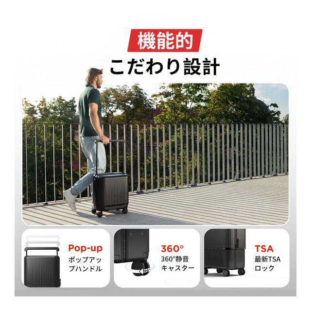 【静音設計で快適移動】 温泉旅館の畳廊下でもスムーズに転がせる、360°回転・完全静音キャスターを搭載。静音レベルは25dBと、ささやき声よりも静か。移動時の音が気にならず、公共の場でも周囲に配慮した使用が可能です。ハンドルは3段階調節式で、日本人の平均身長に合わせた設計。長時間の移動でも腕への負担を軽減します。
