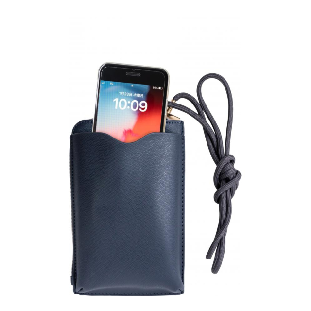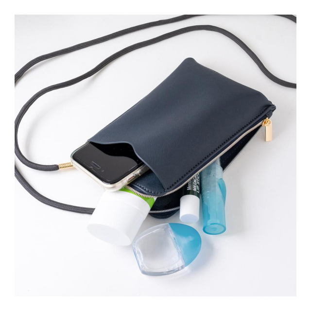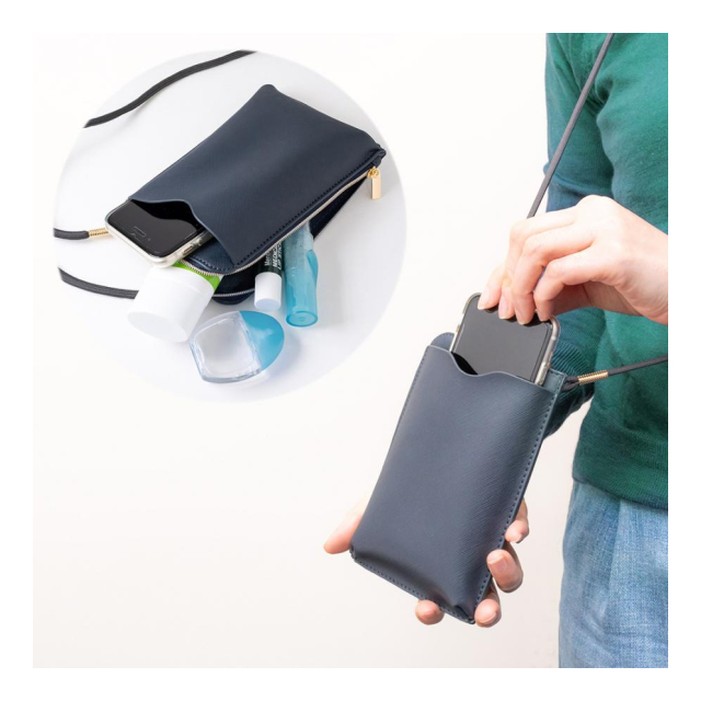前面は機種を選ばない汎用性の高いスマホ用ポーチ。ファスナーポーチ部には小物の収納も可能で、背面にはカードポケットも付いています。このポーチひとつで身軽にお出掛けできます。