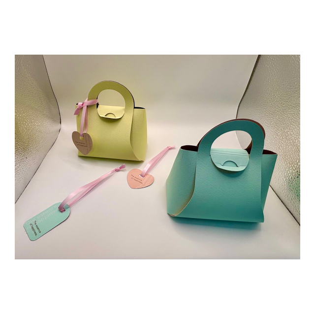 見た目も楽しいバッグ型の焼菓子ボックス。開ける前からワクワクするデザインで、ちょっとした手土産やイベントにもぴったり。『The essence of happiness』のタグが、贈る気持ちをやさしく伝えてくれます。