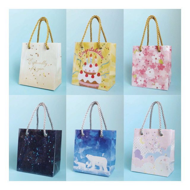 スノードームバッグ・・・当社の伝統的なビニール被せ紙袋を可愛くアレンジした「スノードームバッグ」。その名の通り、ビニールと紙袋の間にキラキラのラメが入っています。豪華な紙袋ですのでプレゼントを入れて渡したあとも活用してもらえそうです。こちらもオリジナルバッグをデザインいたします。ジュエリーショップやプレミアムスイーツショップ、ブライダル用としても利用していただけそうです。