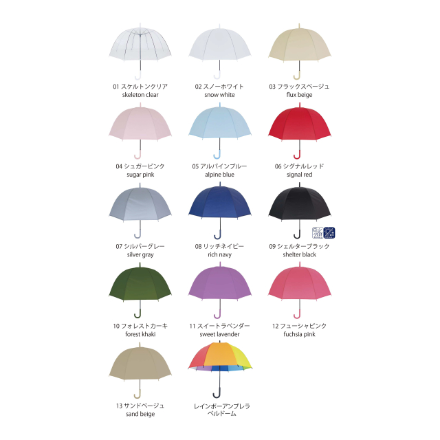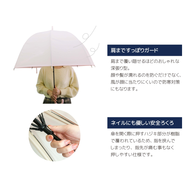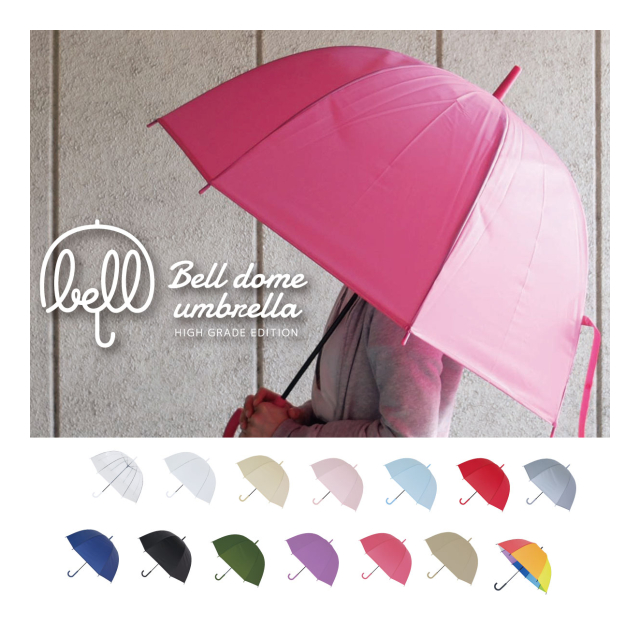 ドーム型のかわいい傘です。肩がすっぽりと傘の中に入る深張り型ですので、激しい雨の時に大切な体や服などを守ります。カラバリ豊富!スケルトンクリアは視界がクリアーなので、例えば雪が降っている時などはとても便利です。