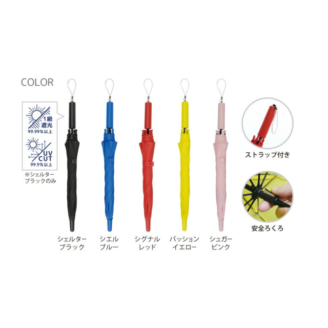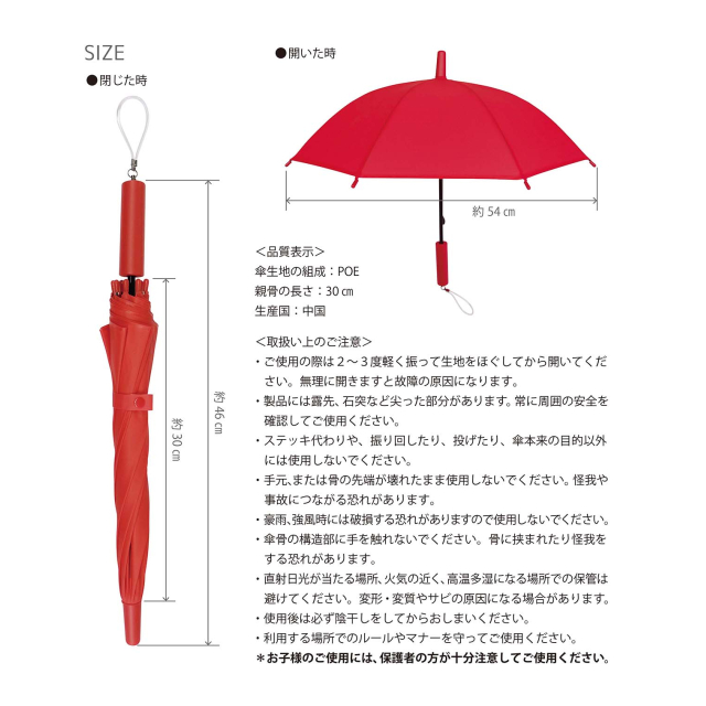 | 素材:生地・露先/POE、親骨・受骨・中棒/鉄(黒)、ハンドル・石突/PP |