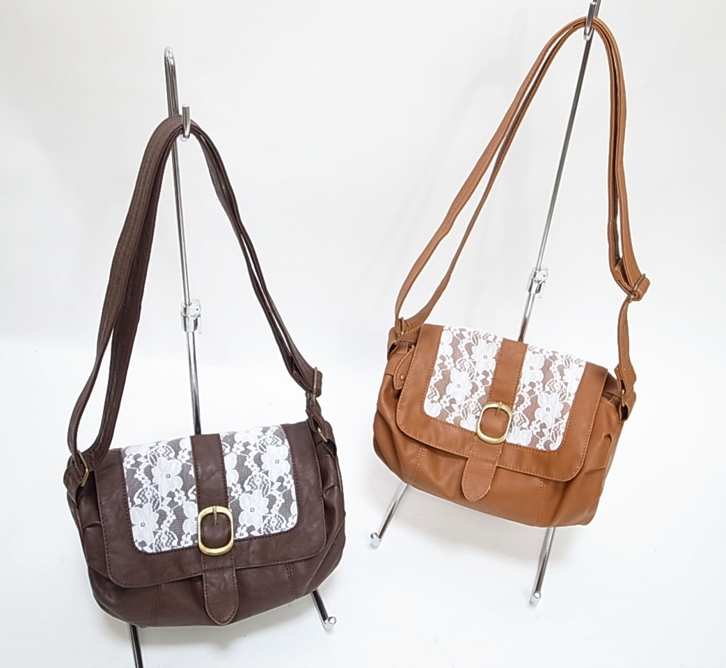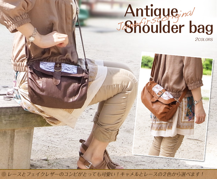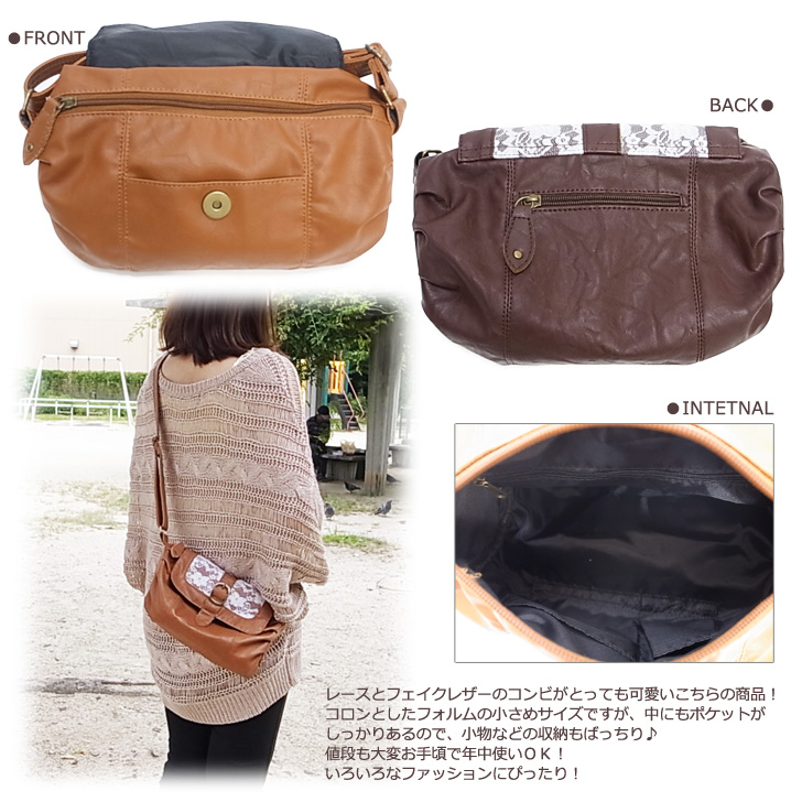 レースとフェイクレザーのコンビがとても可愛いショルダーバッグ。