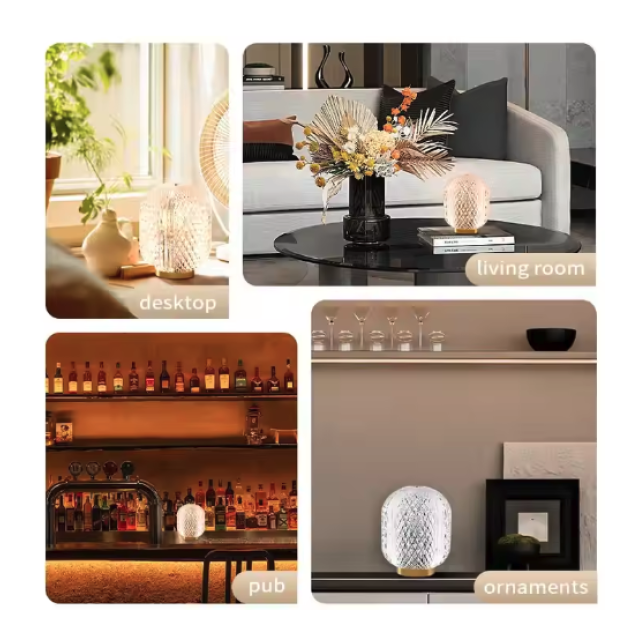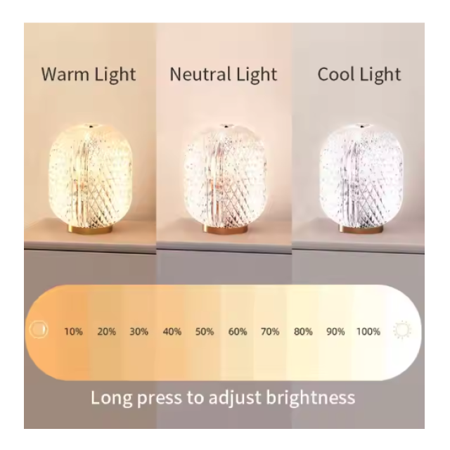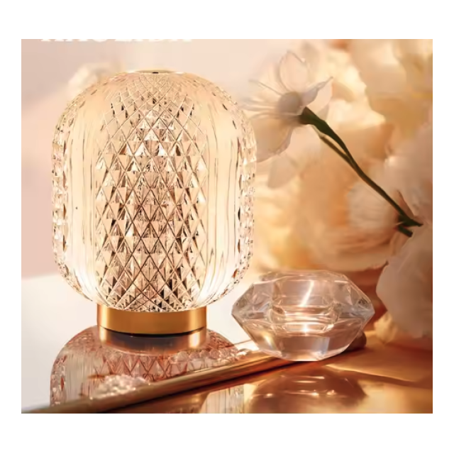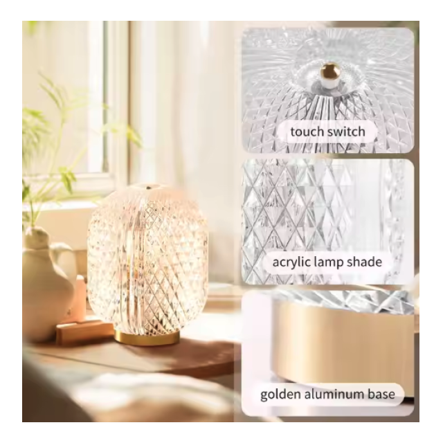 Cheerfulはクリスタルのように透明なアクリル製のオーバル型ランプで、各面にダイヤモンドカットを施し、ゴールドのベースを採用しています。 オーバル型のランプは暖色系ホワイトLEDで照らされ、調光機能を備えており、シーンに応じて美しい光を演出できます。 光の屈折の原理を利用し、どの方向にも柔らかく広がる光を提供します。