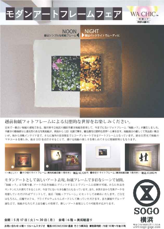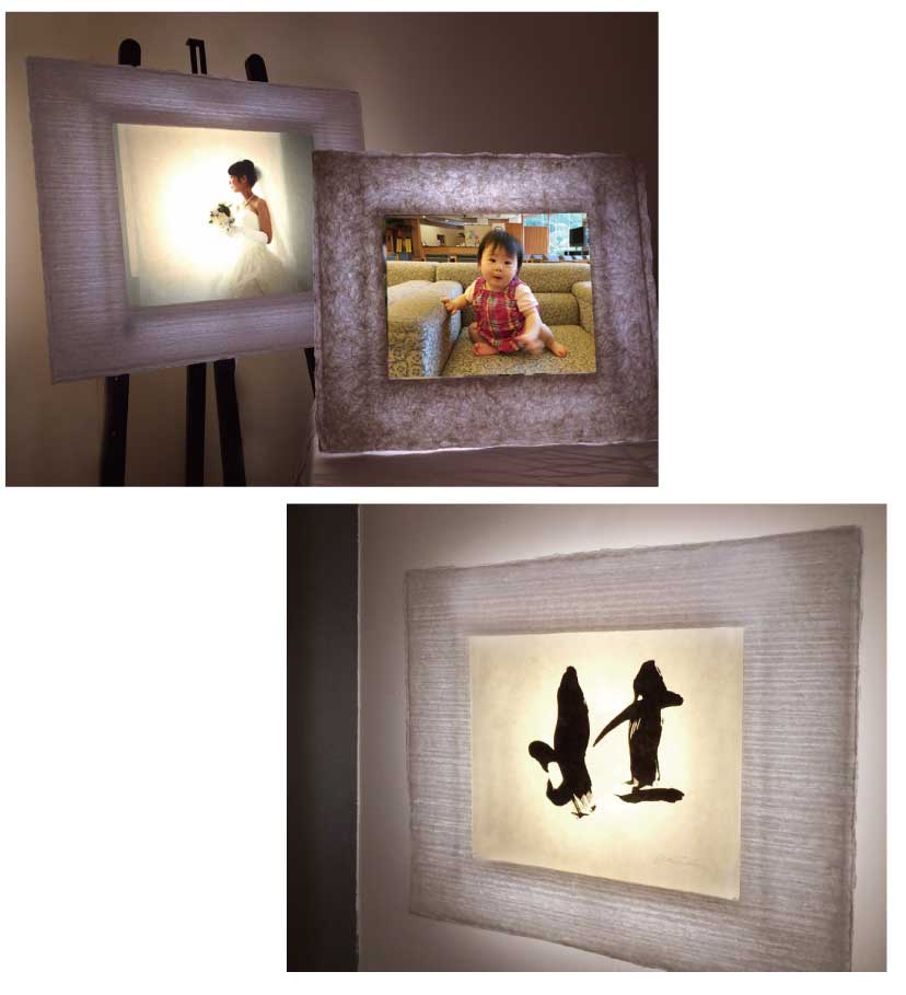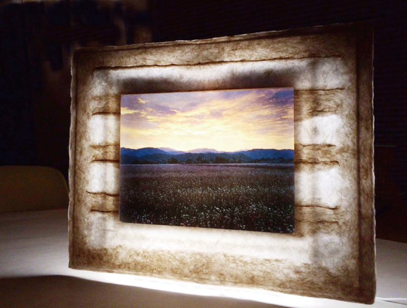 日本で一番古い和紙の産地である、福井県今立地区の越前手漉き和紙を使用して、今までにないフォトフレーム「和紙ック」が誕生しました。(特許出願中)手漉きの額装部分と透光性のある写真和紙が、背面からLED光源で輝き、観る側を幻想的な世界へと導きます。和紙独自の優しくて気品高い風合いが、和から洋風インテリアまで、さらに海外の住空間までとコーディネートできるアートフレームとなっています。昼は自然光で和紙のマチエールを楽しみ、夜はLEDを点灯させることで、透ける和紙の美しさを楽しめてさらに間接照明ともなります。