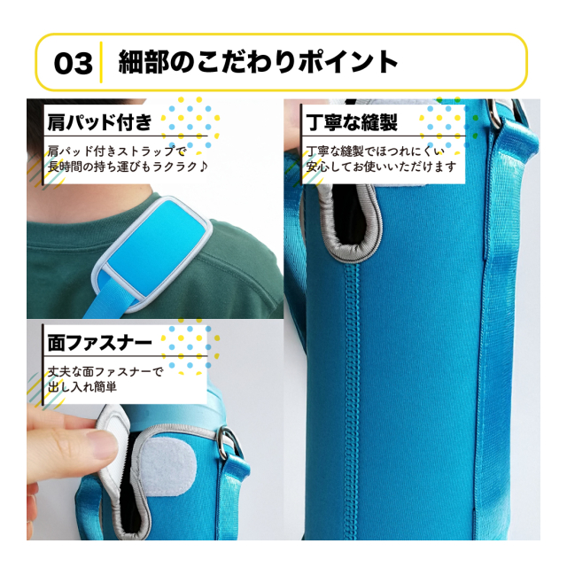 【面ファスナーで固定】水筒をしっかり締めて固定でき、出し入れも簡単