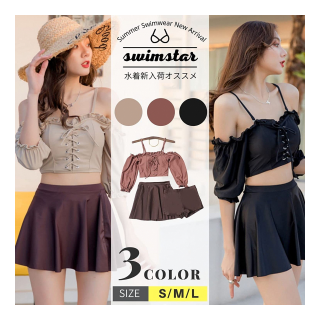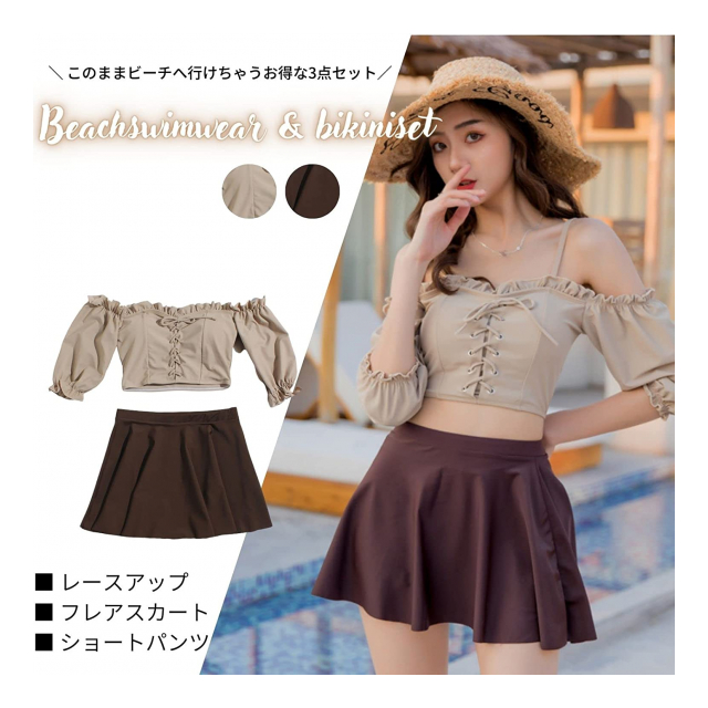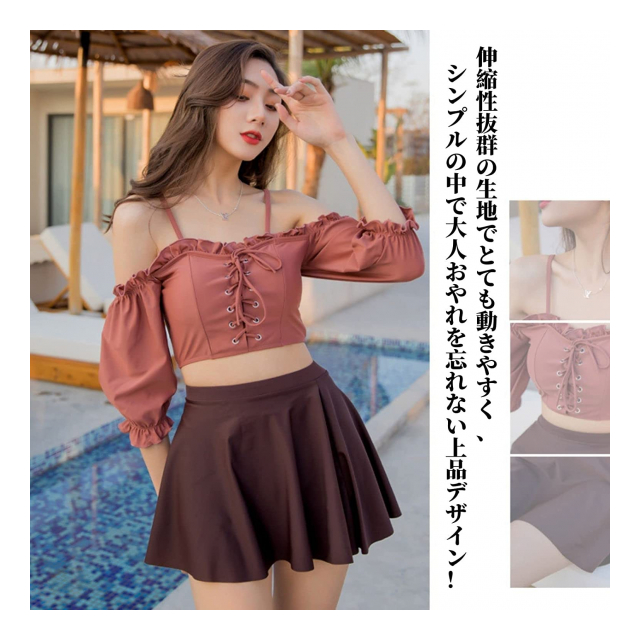 水着 レディース ビキニ オフショルダー ビスチェ風 3点セット 2way レースアップ水着 タンキニ ハイウエスト フリル水着 体型カバー スカート