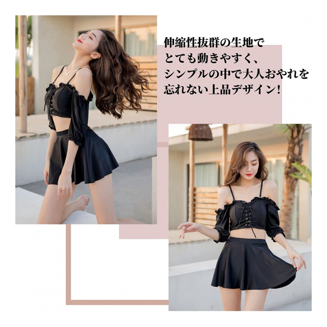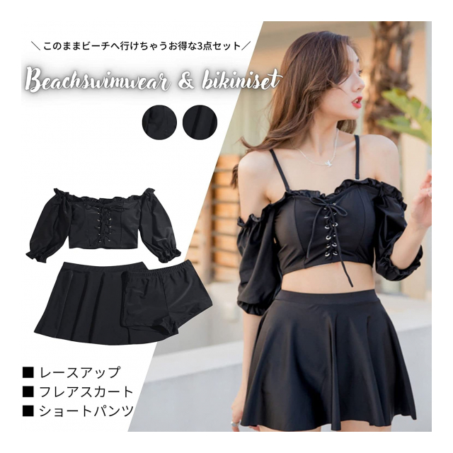 | セット内容・3点セット水着:レースアップ+フレアスカート+ショートパンツ。色っぽさの中にフリル+ストラップで大人の甘さを漂わせる。(サイズガイド:いつもより最低1サイズ大きめをえらぶのがおすすめ。) |