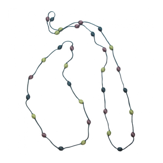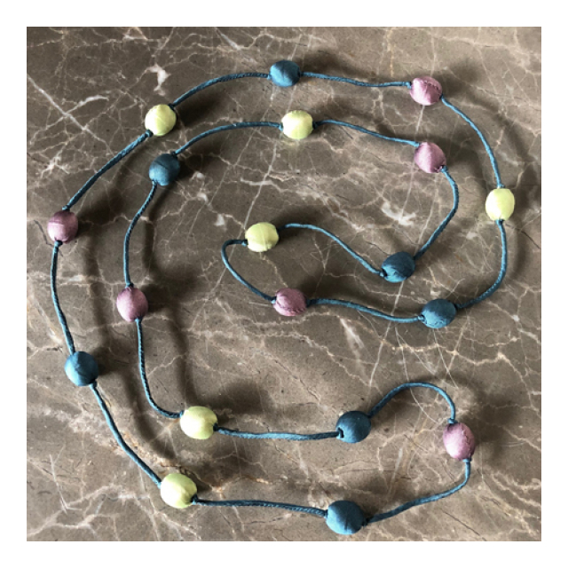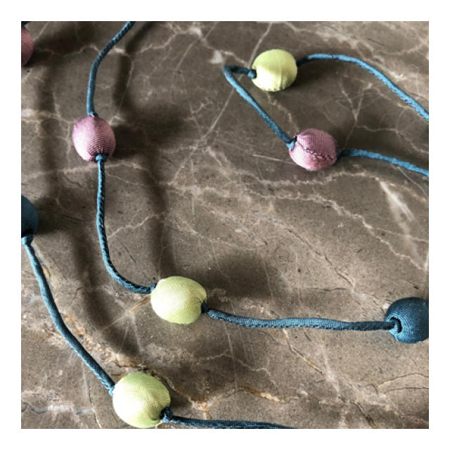 プラスチック製のビーズ玉を一粒ずつ、丁寧に丁寧にシルク生地で包みました。直接、肌に触れる紐部分もシルク生地なので、金属未使用。金属アレルギーの方でも使えるシルクネックレスです。