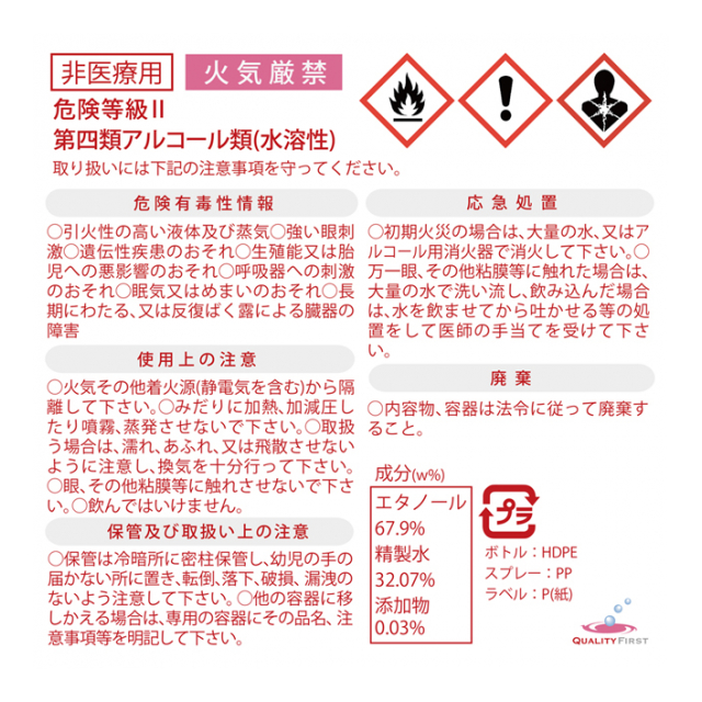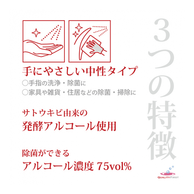 | 主成分 エタノール・水・添加物 アルコール濃度 75% Vol% |