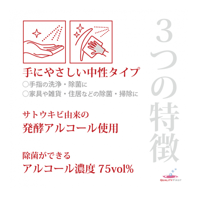 | 主成分 エタノール・水・添加物 アルコール濃度 75% Vol% |